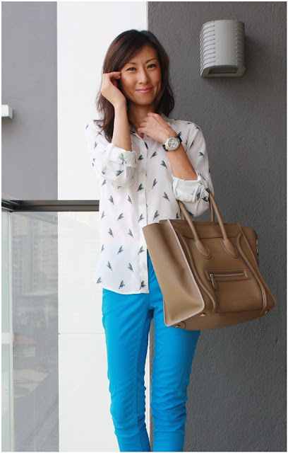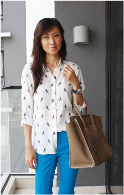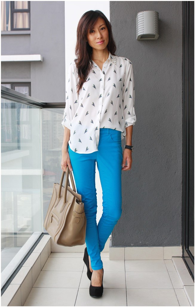 What’s even better is that, it has crystal studs at the collar too! Can you see it? This is like a 2 in 1 top. Bird-prints-with-studs top! It’s like love at 1st sight. What do you think of this top pairing with this bright blue jeans?