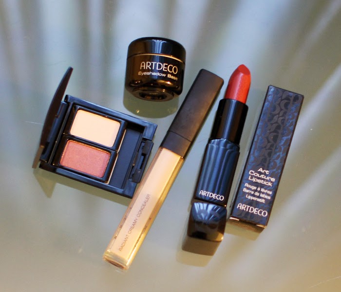 | Eyeshadow Base (Top) Beauty Box Duo Eyeshadows (Left) Concealer (My own & not from Artdeco) Lipstick in (Right) |