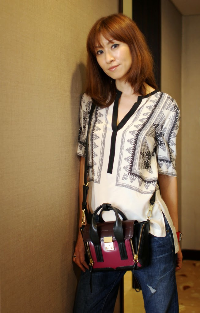 | Top – BCBGMaxazria (on sale here) Boyfriend Jeans – Current/Elliott (available here) Bracelet – Hermes Bag – 3.1 Philip Lim (available here) Oxford Shoes – Miu Miu (similar here) |