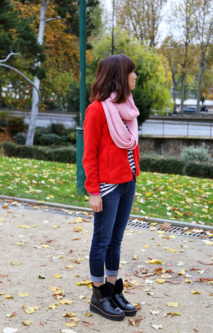 | Tee – Sportsgirl (an Australian brand but similar here) Scarf – Sportsgirl (similar here) Sweater – Uniqlo (similar here) Jeans – 7 For All Mankind (similar and on sale here) Shearling Booties – Coach (similar here) |